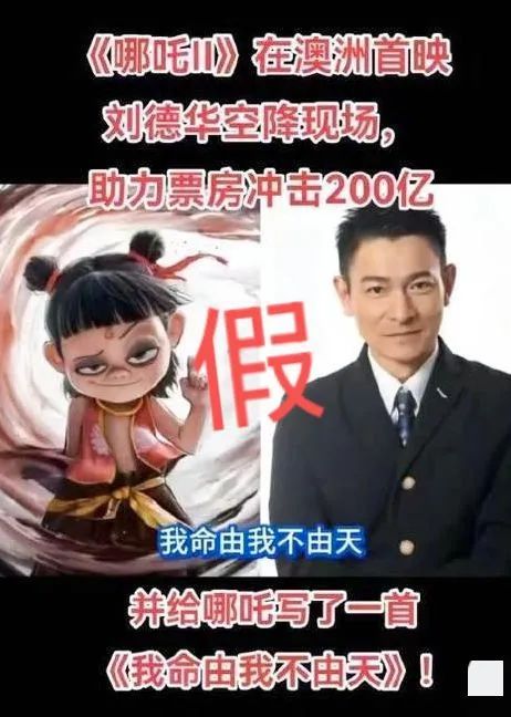 此外,这几天,一则内容为“刘德华在演唱会上喊话观众助力《哪吒2》冲击票房榜,并承诺向所有粉丝赠送《哪吒2》电影票”的视频也在网上广为流传。视频引用了疑似刘德华的声音,以及极具煽动性的配乐,让不少粉丝信以为真,加入传播“刘德华包场支持《哪吒2》”等信息。